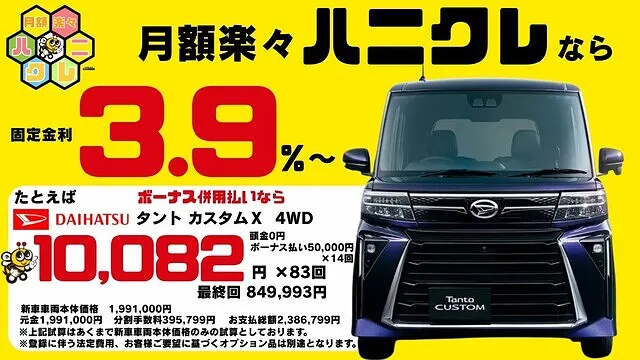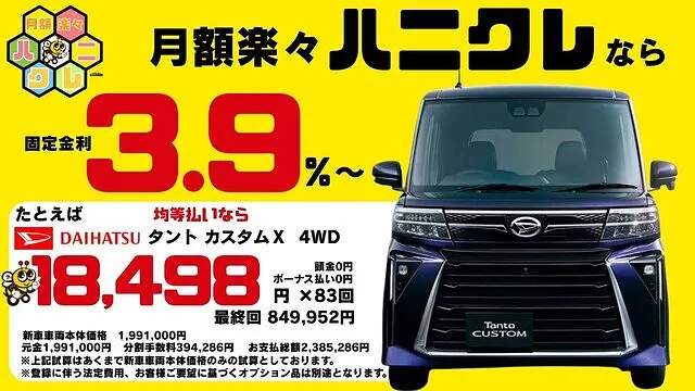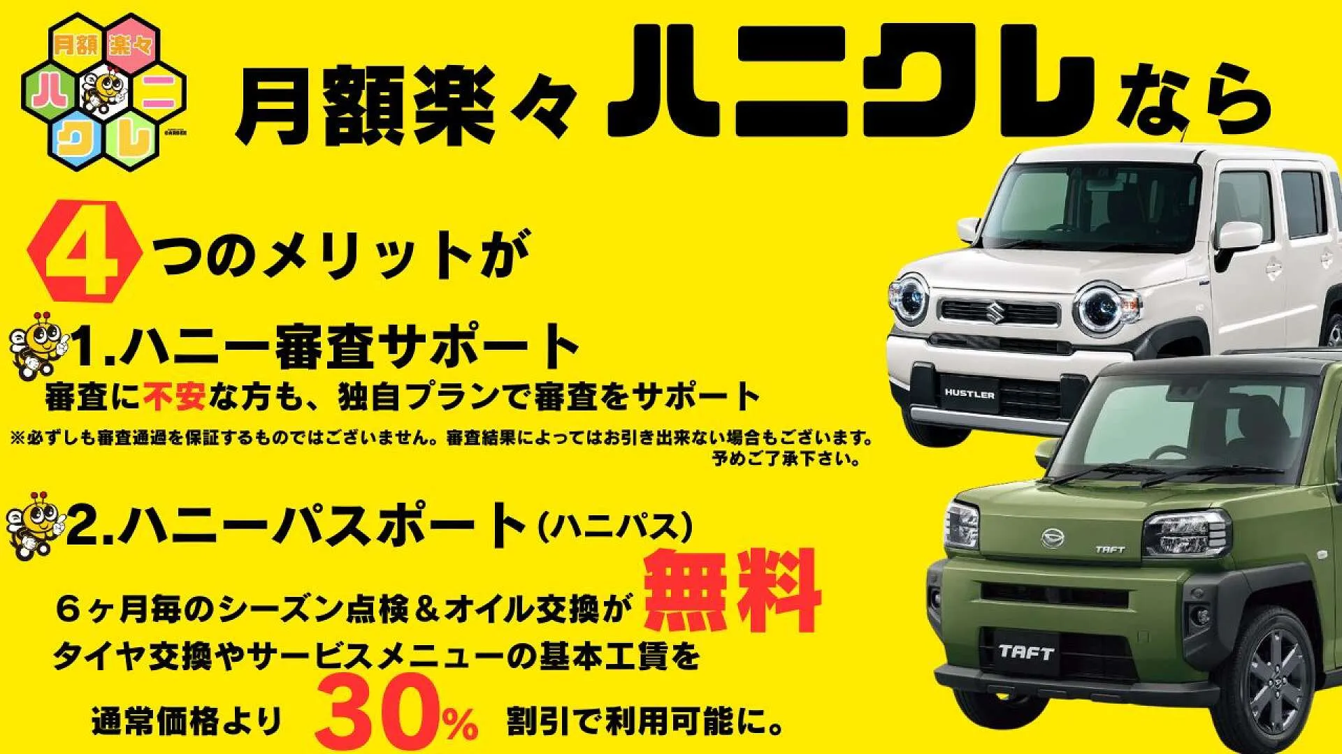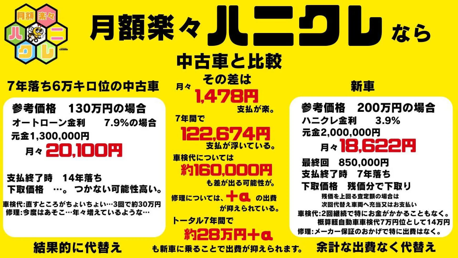 ハニクレなら、新車なんてと諦めていた方にお勧めです! 月々の支払を限りなく甘く設定し、憧れの新車に乗っちゃおう!と。