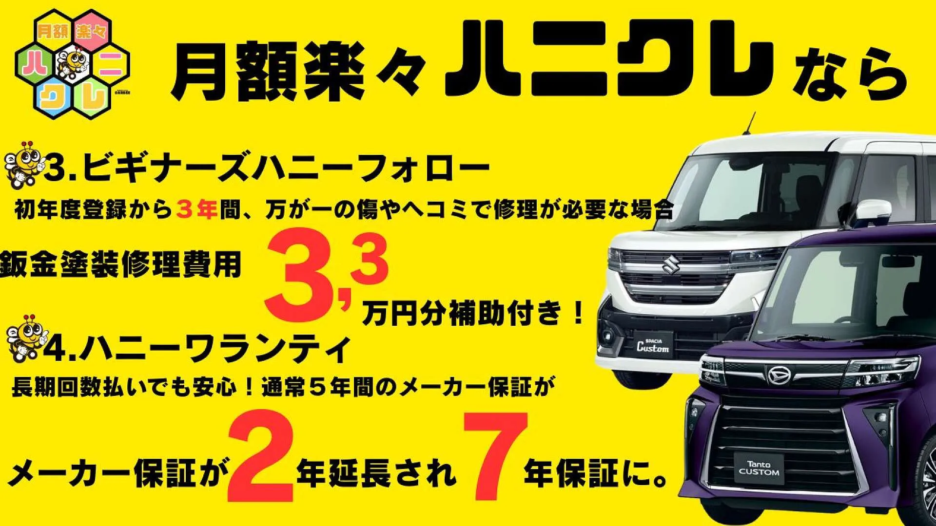 ハニクレにお任せ下さい! 通常新車メーカー保証は5年間保証されておりますが、ハニクレご利用で、